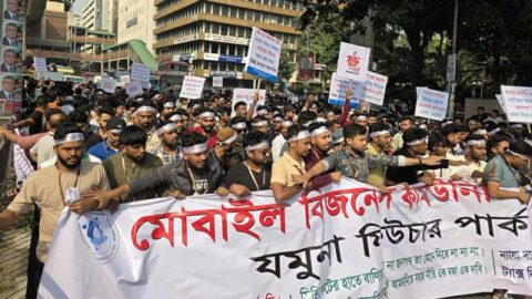কাওরান বাজারে মোবাইল ফোন ব্যবসায়ীদের মানববন্ধন