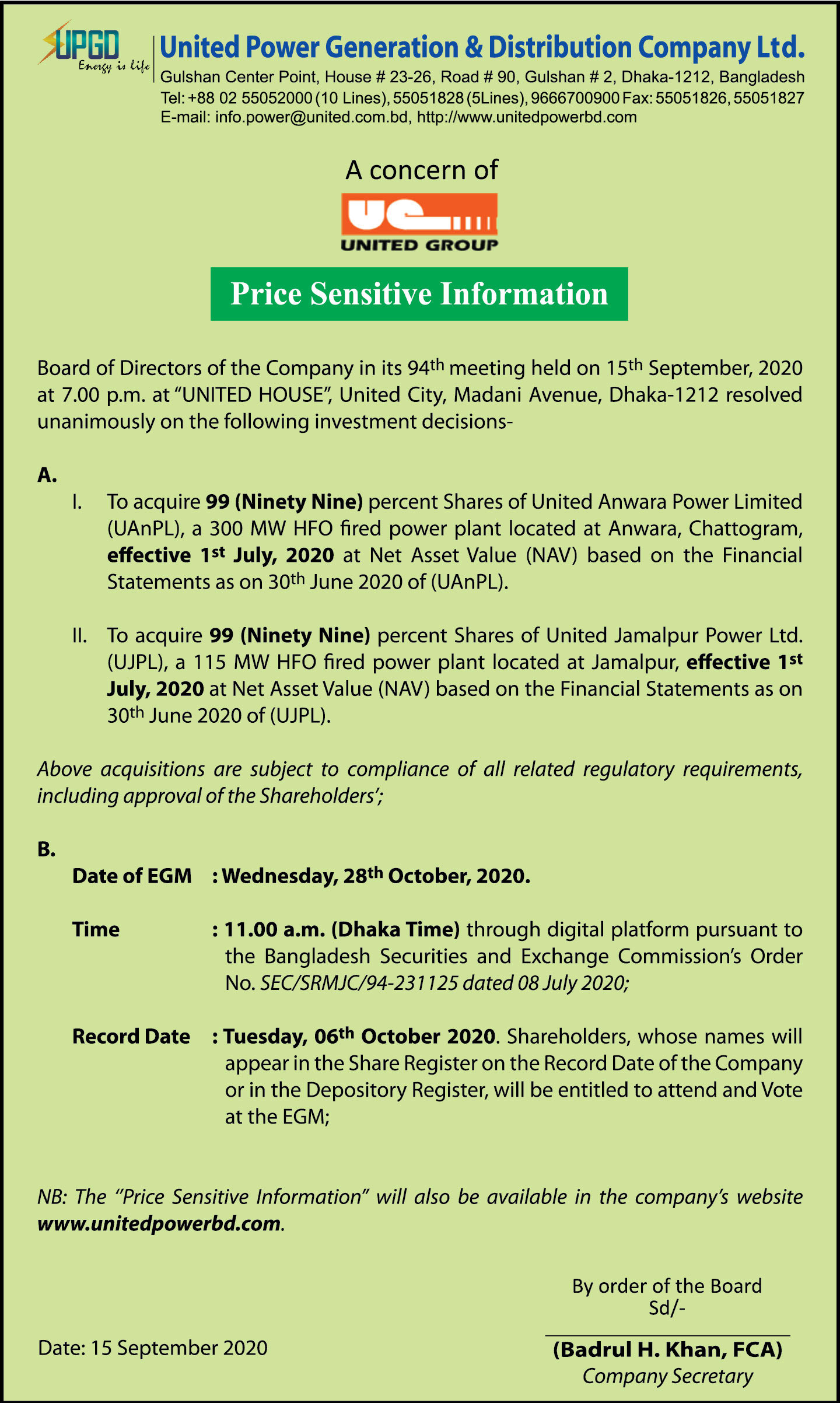 Price Sensitive Information of United Power Generation & Distribution Co. Ltd.
