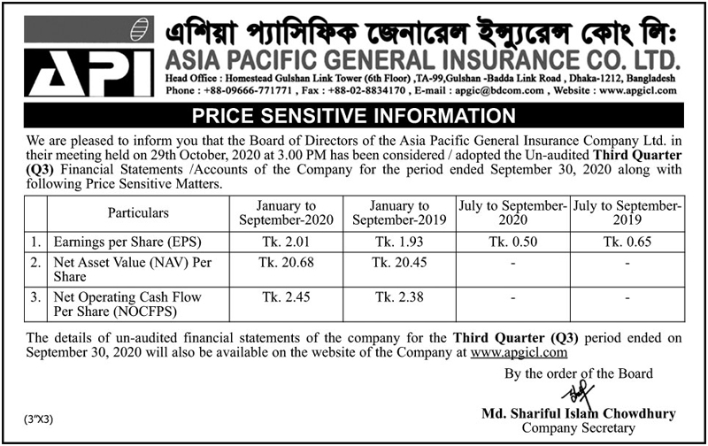 Price Sensitive Information of Asia Pacific General Insurance Co. Ltd.