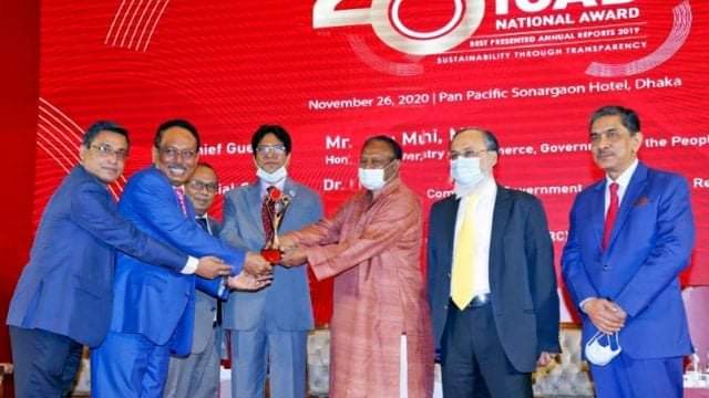 গত ২৬ নভেম্বর বৃহষ্পতিবার রাজধানীর সোনারগাঁও হোটেলে আইসিএবি কর্তৃক আয়োজিত অনুষ্ঠানের প্রধান অতিথি বাণিজ্যমন্ত্রী টিপু মুনশি, এমপি, মার্কেন্টাইল ব্যাংকের ব্যবস্থাপনা পরিচালক ও প্রধান নির্বাহী মোঃ কামরুল ইসলাম চৌধুরী ও সিএফও তাপস চন্দ্র পাল, পিএইচডির হাতে ওই পুরস্কারের ক্রেস্ট ও সনদ তুলে দেন।