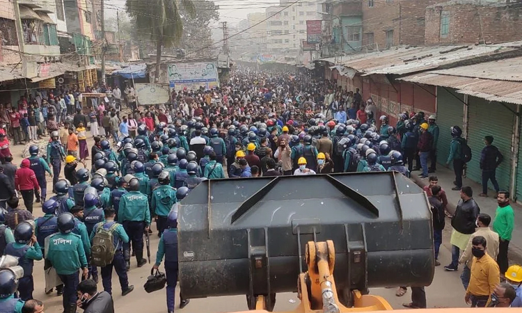 সকাল সাড়ে ১০টার দিকে সড়কের একটি স্থাপনা ভাঙতে গেলে স্থানীয় ব্যক্তিরা ডিএনসিসির কর্মকর্তা ও পুলিশকে লক্ষ্য করে ইটপাটকেল ছুড়তে শুরু করেন। এরপর ডিএনসিসির কর্মকর্তারা পিছু হটেন।