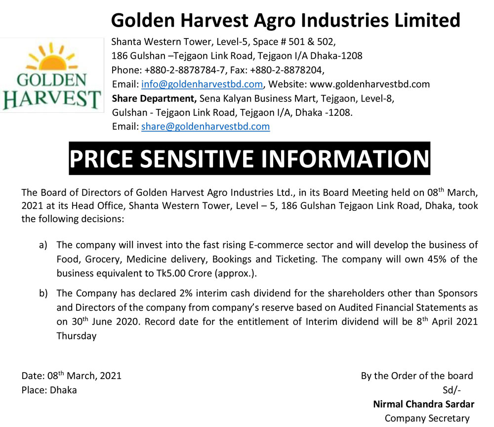 Price Sensitive Information of Golden Harvest Agro Industries Ltd.