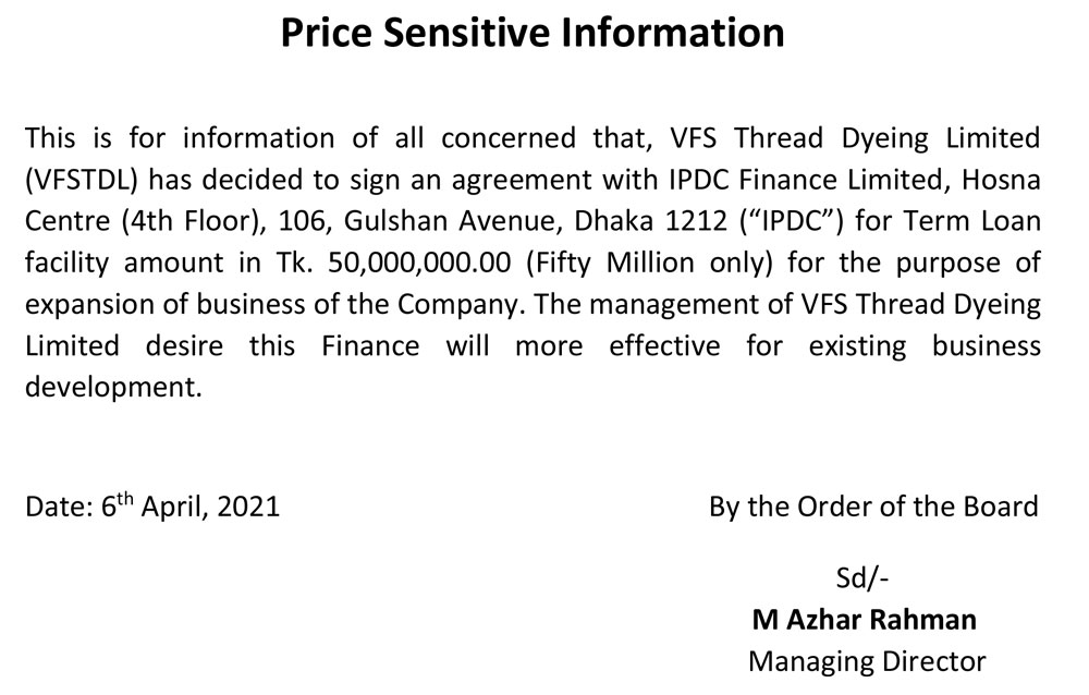 Price Sensitive Information of VFS Thread Dyeing Limited