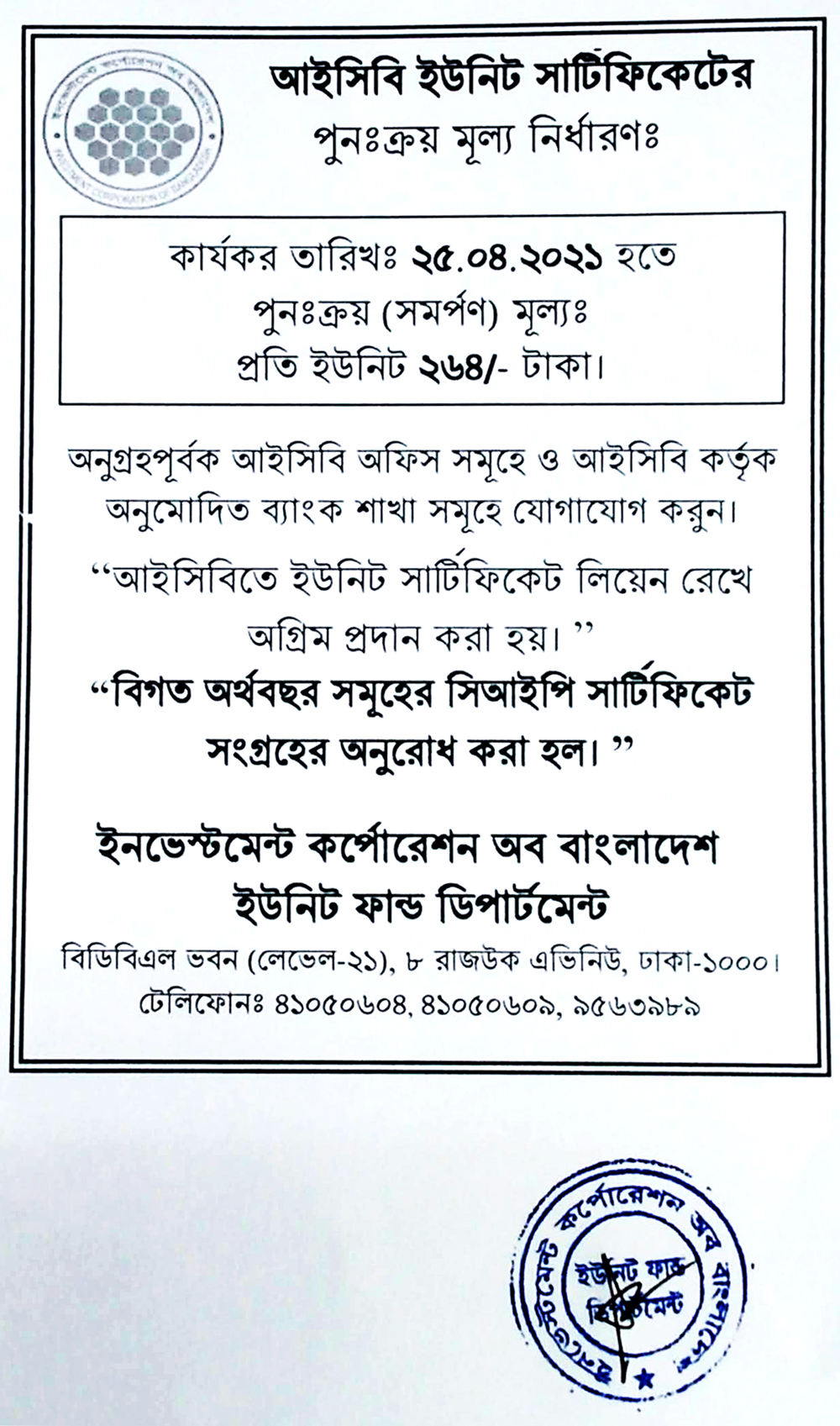 আইসিবি ইউনিট সার্টিফিকেটের পুনঃক্রয় মূল্য নির্ধারন