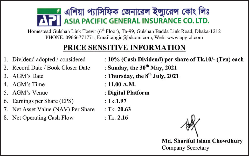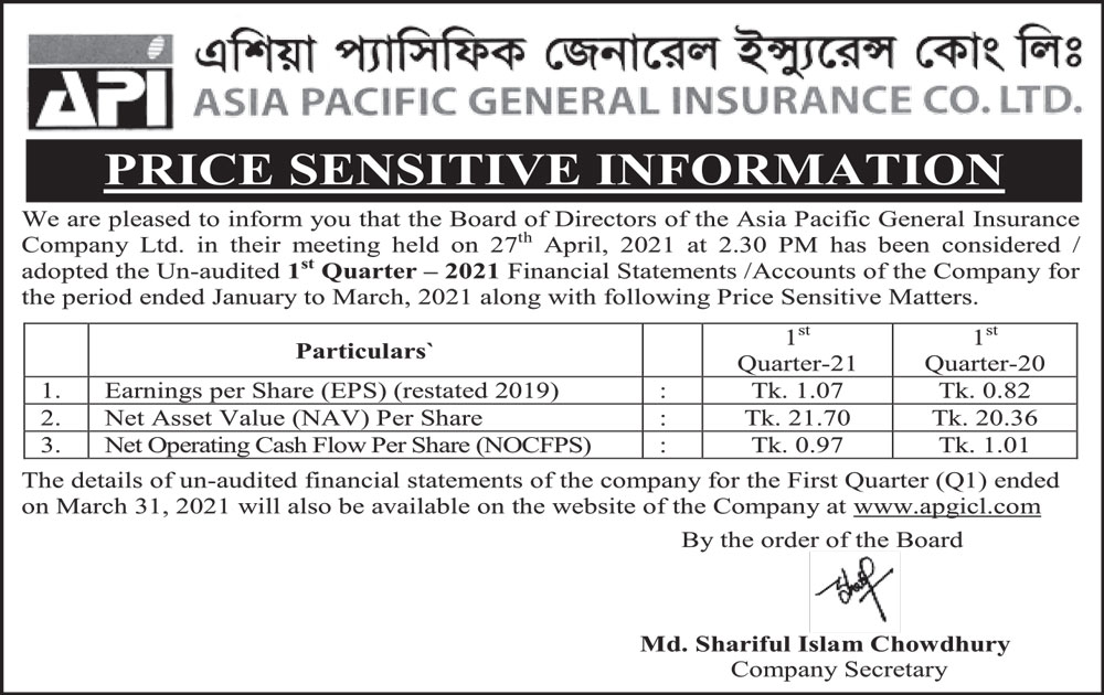 Price Sensitive Information of Asia Pacific General Insurance Co. Ltd