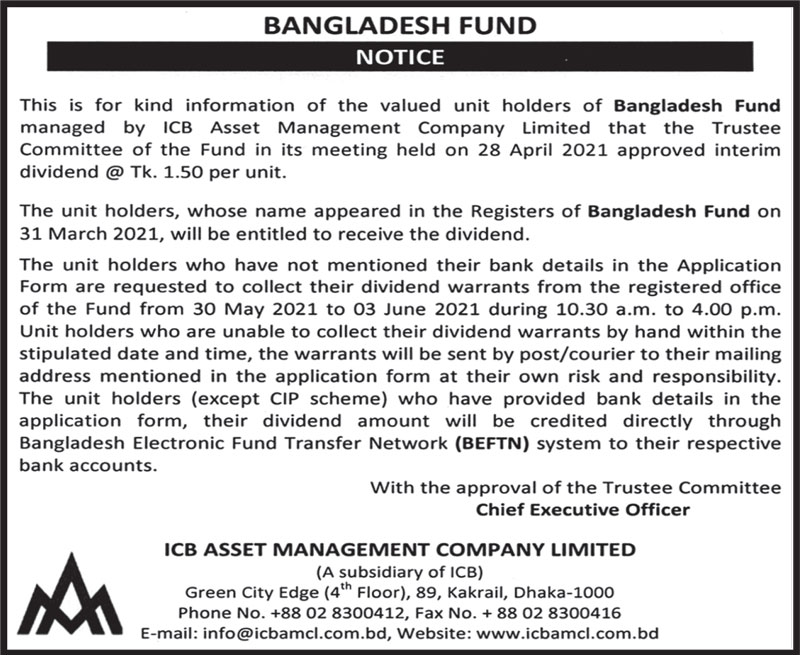 আইসিবি এএমসিএল পরিচালিত বাংলাদেশ ফান্ড এর অন্তর্বর্তীকালীন লভ্যাংশ ঘোষণা