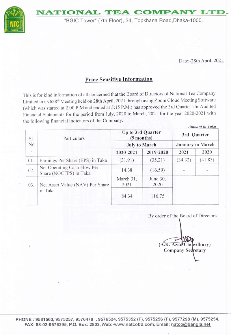 Price Sensitive Information of National Tea Company Ltd.