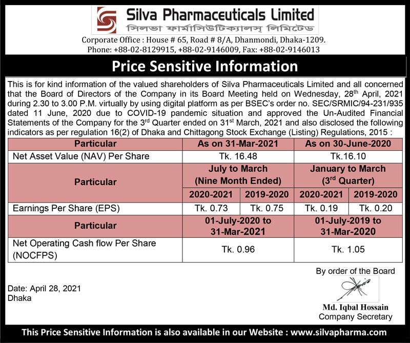 Price Sensitive Information of Silva Pharmaceuticals Limtied