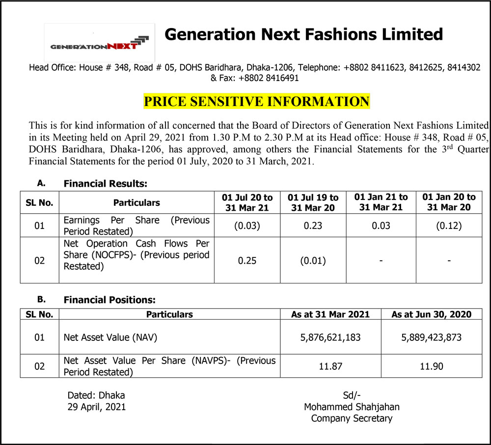 Price Sensitive Information of Generation Next Fashions Limited