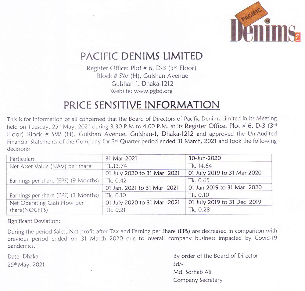 Price Sensitive Information of Pacific Denims Limited