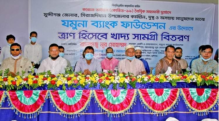 যমুনা ব্যাংক ফাউন্ডেশনের উদ্যোগে মুন্সিগঞ্জ জেলার সিরাজদিখান উপজেলায় বৈশ্বিক মহামারী দুর্যোগ করোনা ভাইরাসের কারনে কর্মহীন, দুস্থ ও অসহায় মানুষের মাঝে ত্রাণ হিসাবে খাদ্য সামগ্রী বিতরণ করা হয়। মুন্সিগঞ্জের সাবেক এমপি ও আলহাজ্ব নূর মোহাম্মদ ট্রাষ্টের প্রতিষ্ঠাতা এবং যমুনা ব্যাংক ফাউন্ডেশনের চেয়ারম্যান আলহাজ্ব নূর মোহাম্মদ প্রধান অতিথি হিসেবে উপস্থিত থেকে উক্ত খাদ্য সামগ্রী বিতরণ অনুষ্ঠানের উদ্বোধন করেন।