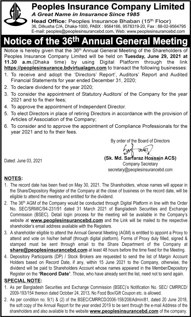 Notice of the 36th AGM of Peoples Insurance Company Limited