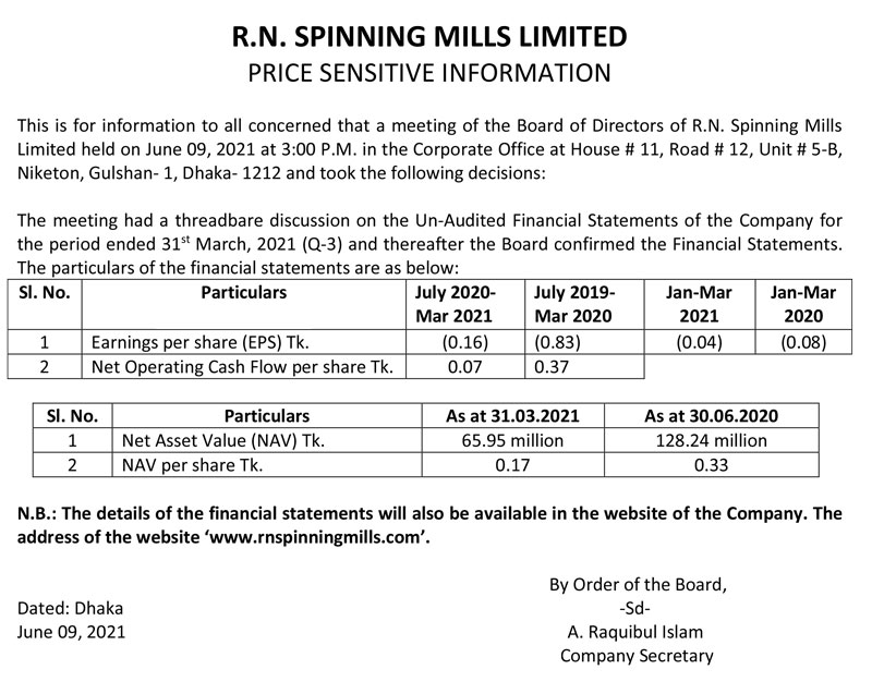Price Sensitive Information of R.N. Spinning Mills Ltd.