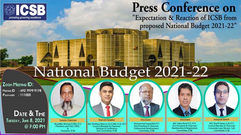 ইন্সটিটিউট অব চার্টার্ড সেক্রেটারিজ অব বাংলাদেশ (আইসিএসবি) “প্রস্তাবিত জাতীয় বাজেট ২০২১-২২ থেকে আইসিএসবির প্রত্যাশা ও প্রতিক্রিয়া’’ শীর্ষক প্রেস কনফারেন্স ভার্চুয়ালি আয়োজন করে। প্রোগ্রামের সভাপতিত্ব করেন মোজাফফর আহমেদ এফসিএস, প্রেসিডেন্ট, আইসিএসবি।