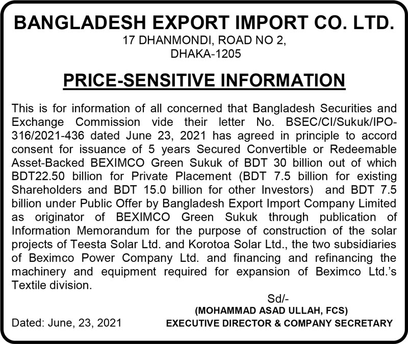 Price Sensitive Information of Bangladesh Export Import Co. Ltd.