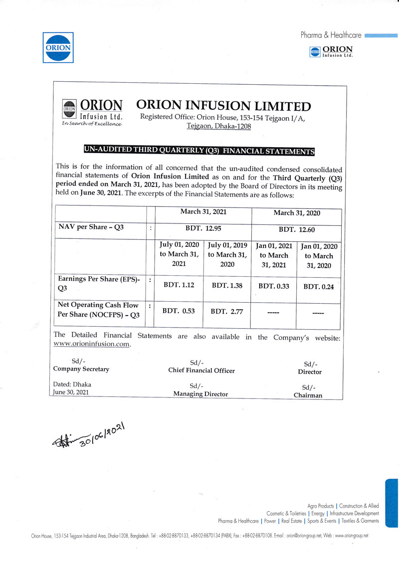 Un-audited Q3 Financial Statements of Orion Infusion Limited