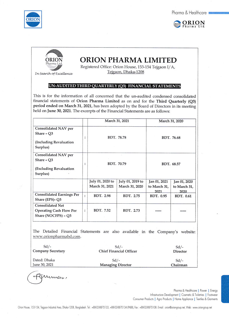 Un-audited Q3 Financial Statements of Orion Pharma Limited