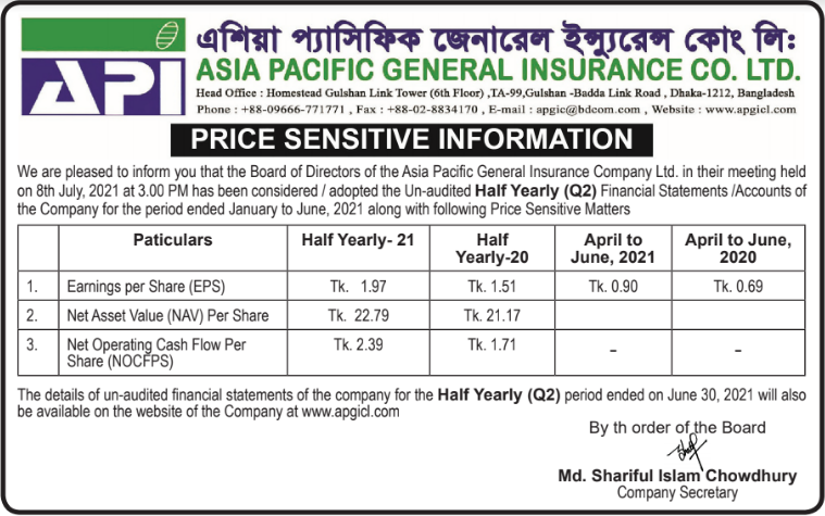 Price Sensitive Information of Asia Pacific General Insurance Co. ltd