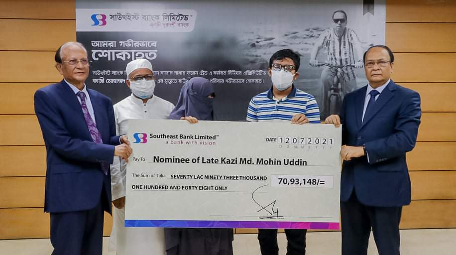 মরহুম কাজী মোহাম্মদ মহিন উদ্দিন সাউথইস্ট ব্যাংক লিমিটেড, কাওরান বাজার শাখার ফরেন ট্রেড এ সিনিয়র এক্সিকিউটিভ অফিসার হিসেবে কর্মরত ছিলেন। সাউথইস্ট ব্যাংকে কর্মরত অবস্থায় মরহুম কাজী মোহাম্মদ মহিন উদ্দিন এর প্রাপ্য সকল প্রকারের আর্থিক সুবিধাসহ করোনা ভাইরাসে মৃত ব্যাংক কর্মকর্তার ক্ষেত্রে বাংলাদেশ ব্যাংকের নির্দেশনা অনুযায়ী আর্থিক অনুদানের চেকটি প্রদান করা হয়।
