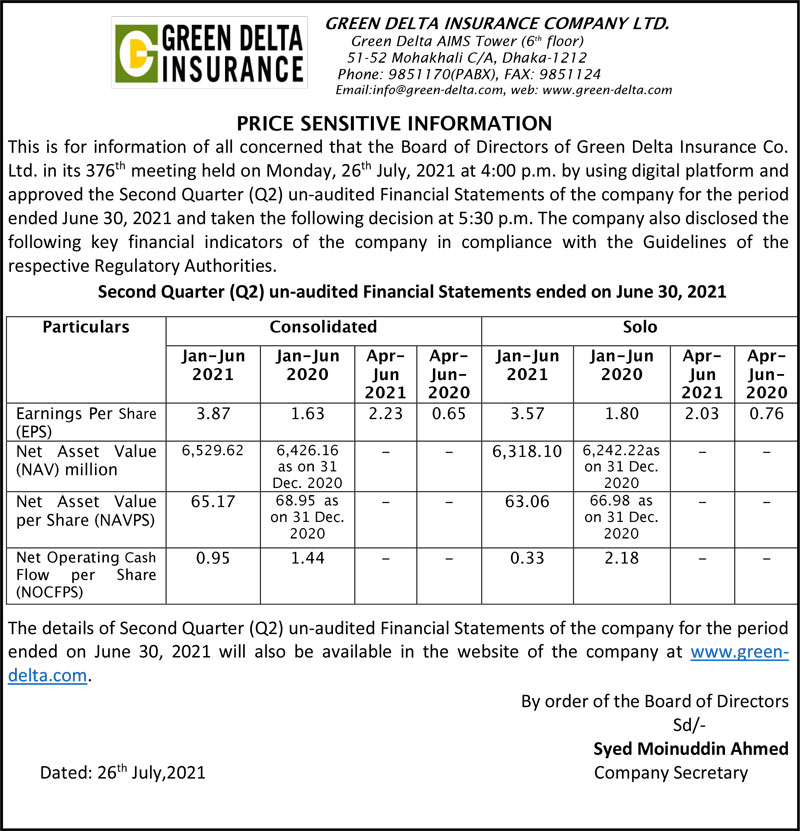 Price Sensitive Information of Green Delta Insurance