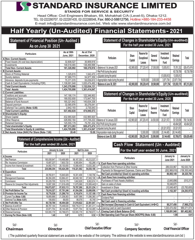 Half Yearly (Un-audited) Financial Statements of Standard Insurance Limited