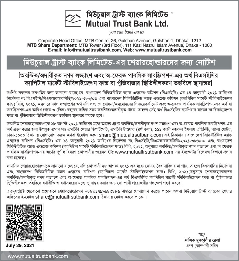 Notice to the Shareholders of Mutual Trust Bank Limited