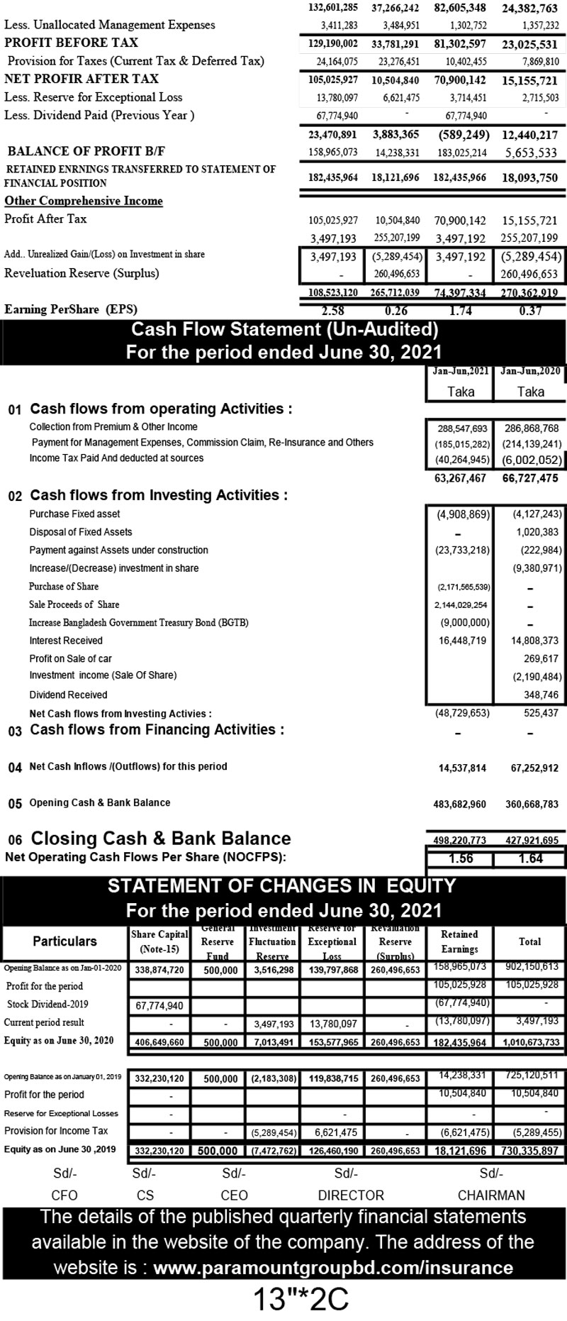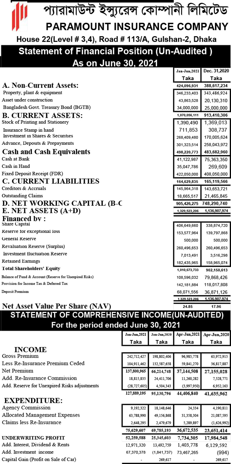 Statements of Financial Position (Un-audited) of Paramunt Insurance Comapany