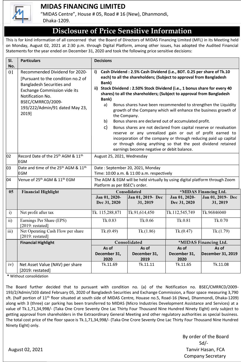 Disclosure of Price Sensitive Information of MIDAS Finance Limited
