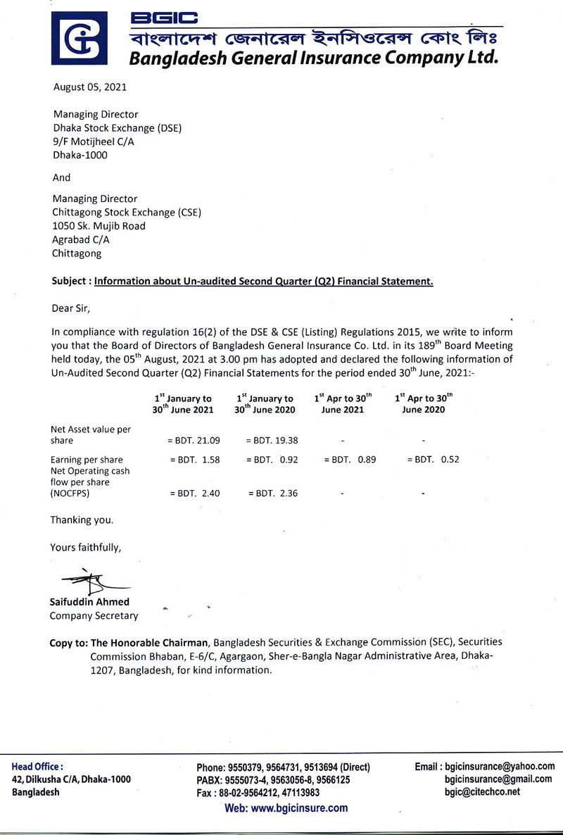 Q2 Unaudited Financial Statements of Bangladesh General Insurance Company Ltd.