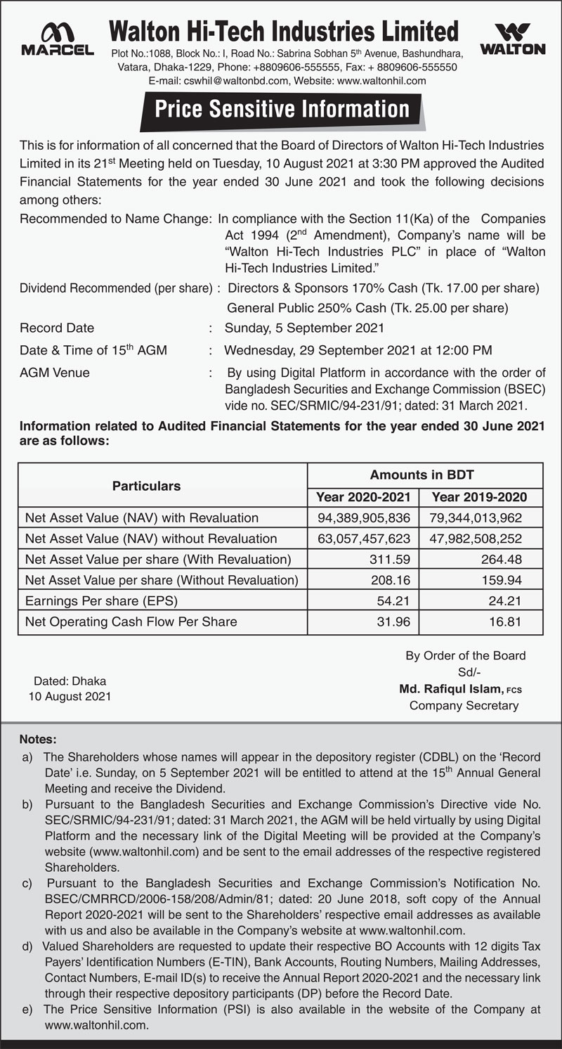 Price Sensitive Information of Walton Hi-Tech Industries Ltd.