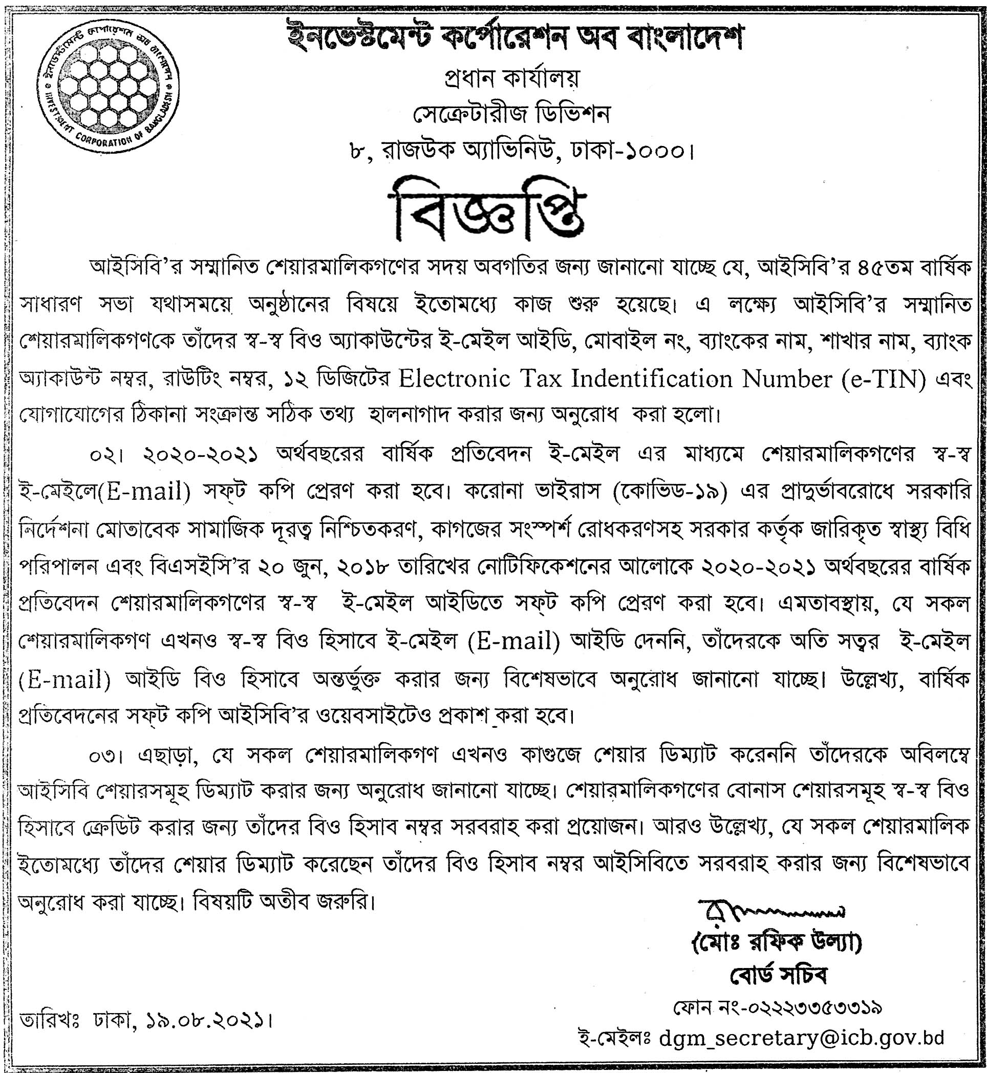 Notice of Investment Corporation of Bangladesh