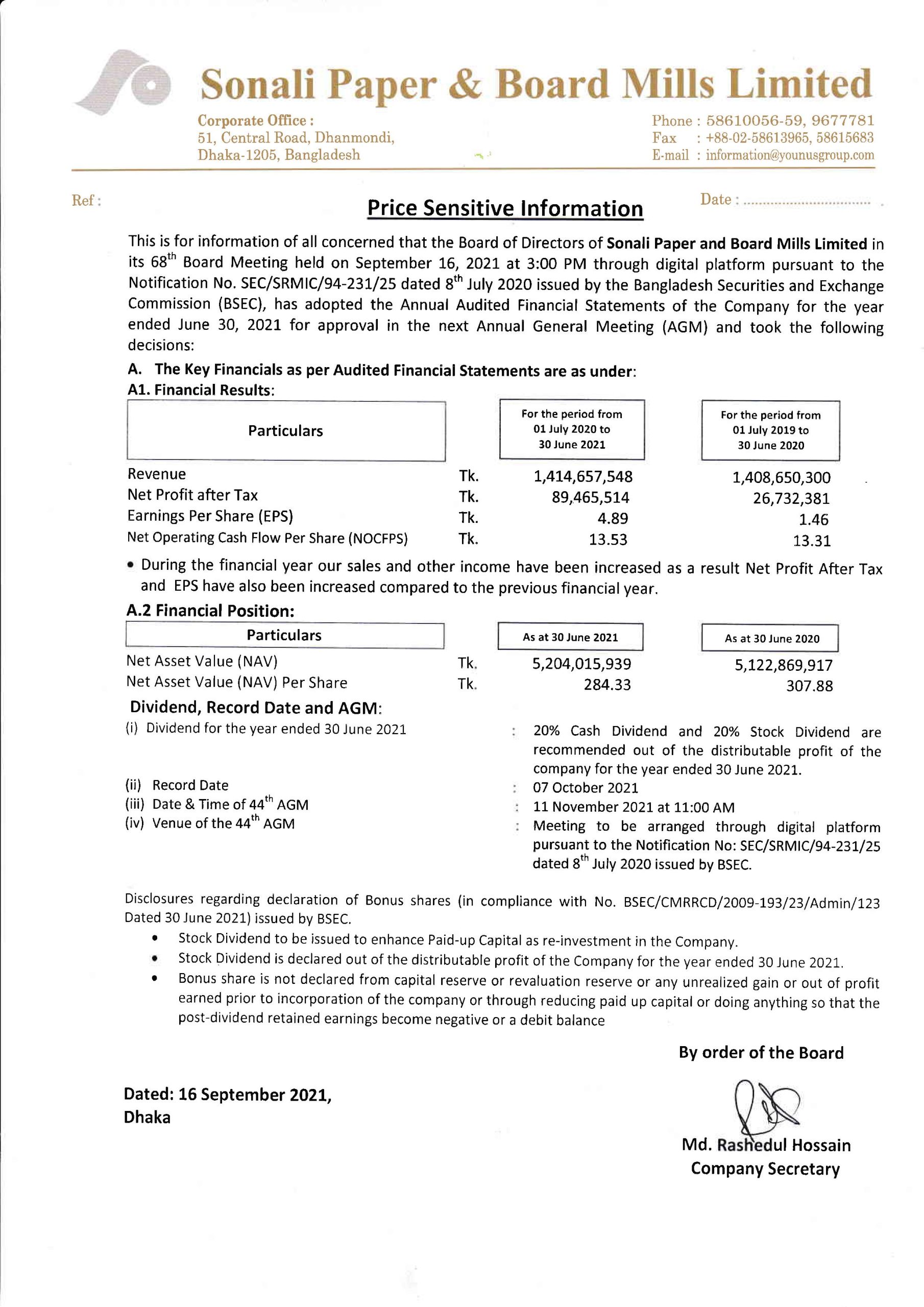 Price Sensitive Information of Sonali Paper & Board Mills Limited