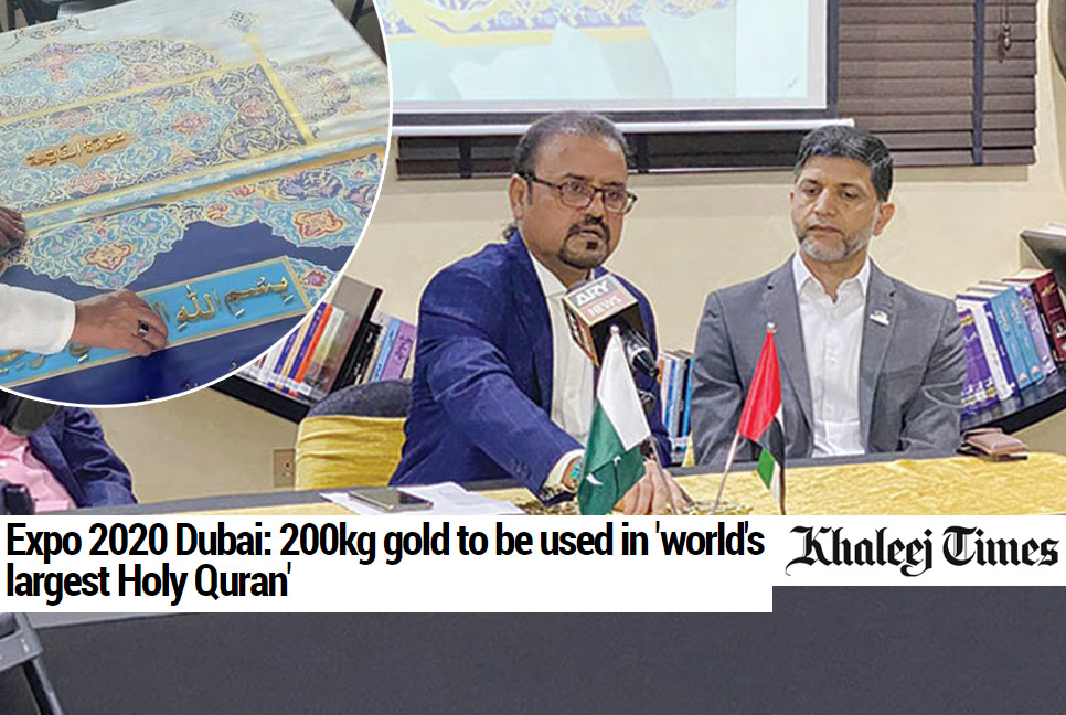 এবার ২০০ কেজি স্বর্ণ দিয়ে ‘বিশ্বের সর্ববৃহৎ কোরআন’ তৈরির দাবি করা হলো। জানা গেছে, পাকিস্তানি শিল্পী শহিদ রাসাম ও চারশ’ শিক্ষার্থীর একটি দল এই শিল্পকর্মটি করেছেন। বিপুল পরিমাণ স্বর্ণের সাথে এতে দুই হাজার কেজি অ্যালুমিনিয়ামও ব্যবহার করা হয়েছে।