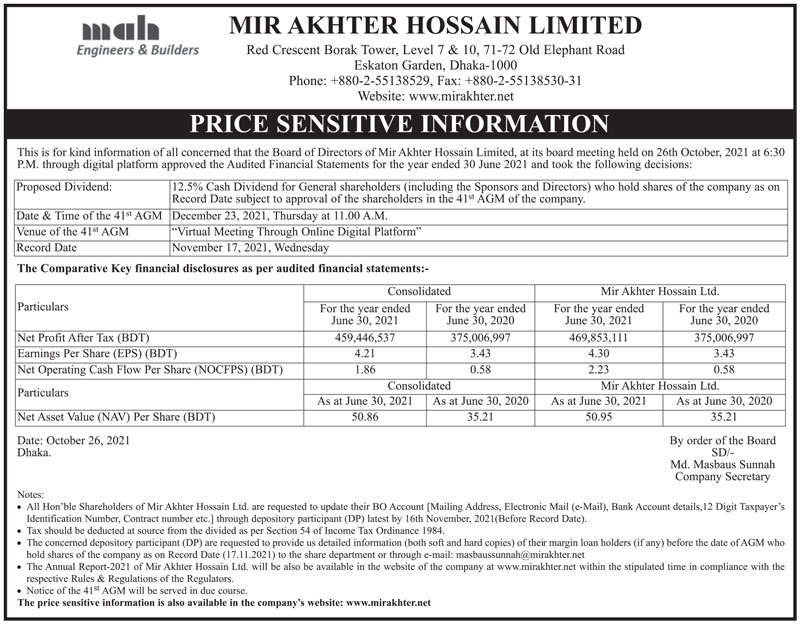 Price Sensitive Information of Mir Akhter Hossain Ltd.