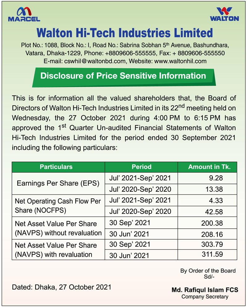 Disclosure of Price Sensitive Information of Walton Hi-Tech Industries Ltd