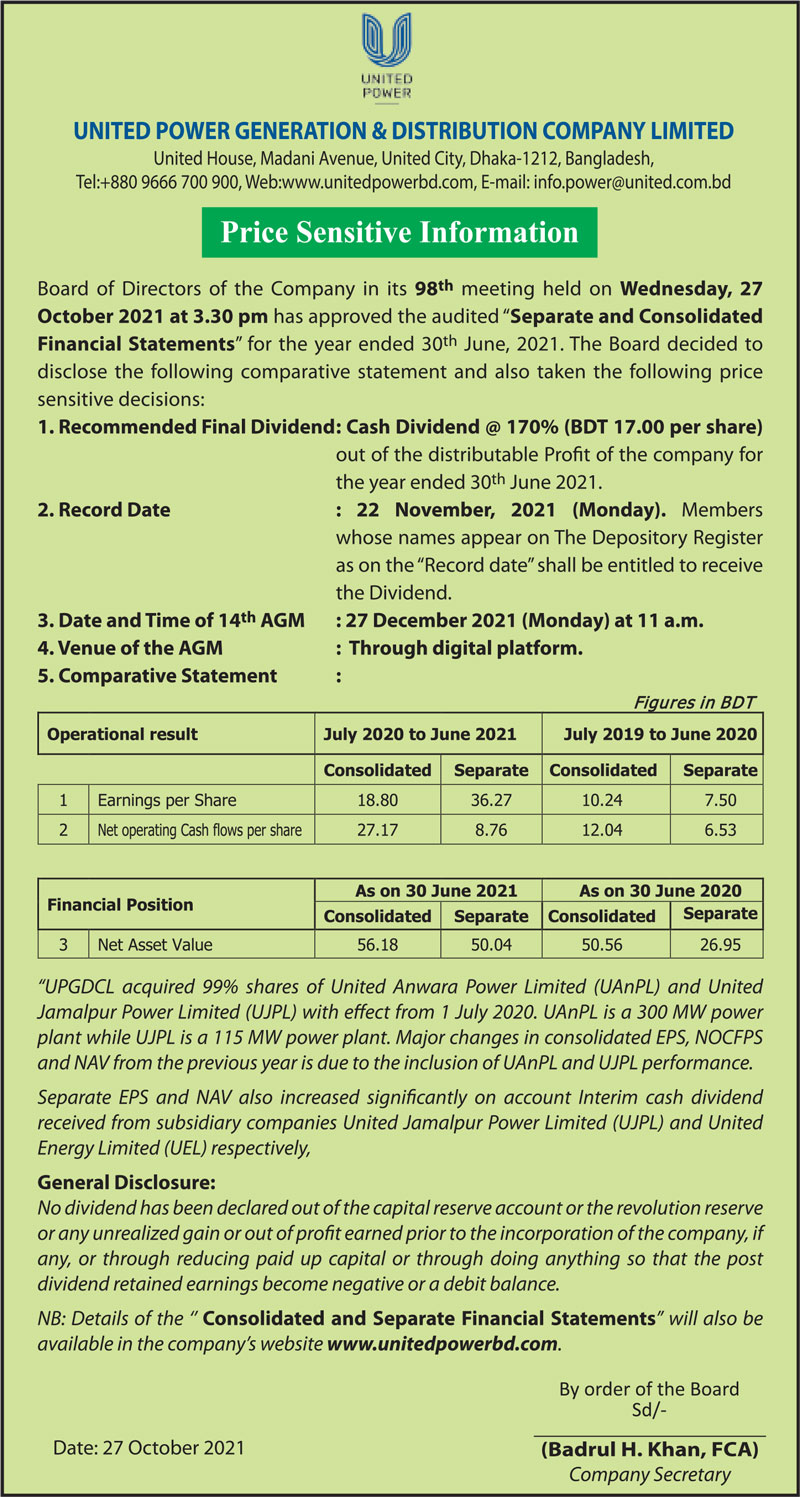Price Sensitive Information of United Power Generation & Distribution Company Ltd
