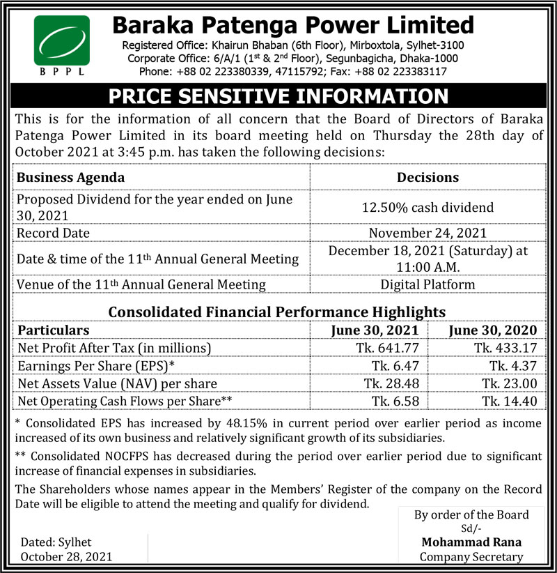 Price Sensitive Information of Baraka Patenga Power Limited