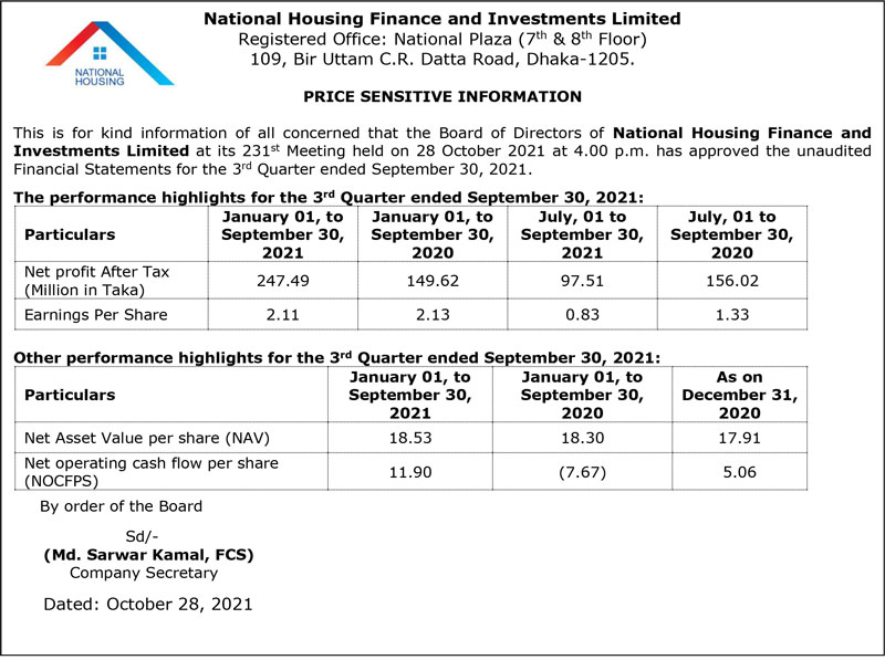 Price Sensitive Information of National Housing Finance and Investments Limited