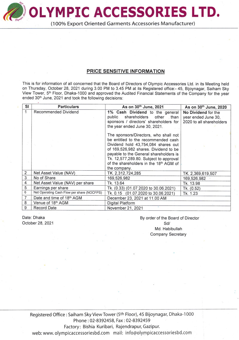 Price Sensitive Information of Olympic Accessories Ltd.