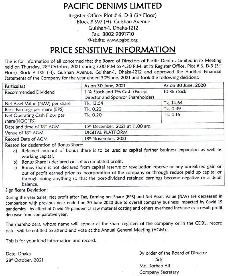 Price Sensitive Information of Pacific Denims Limited