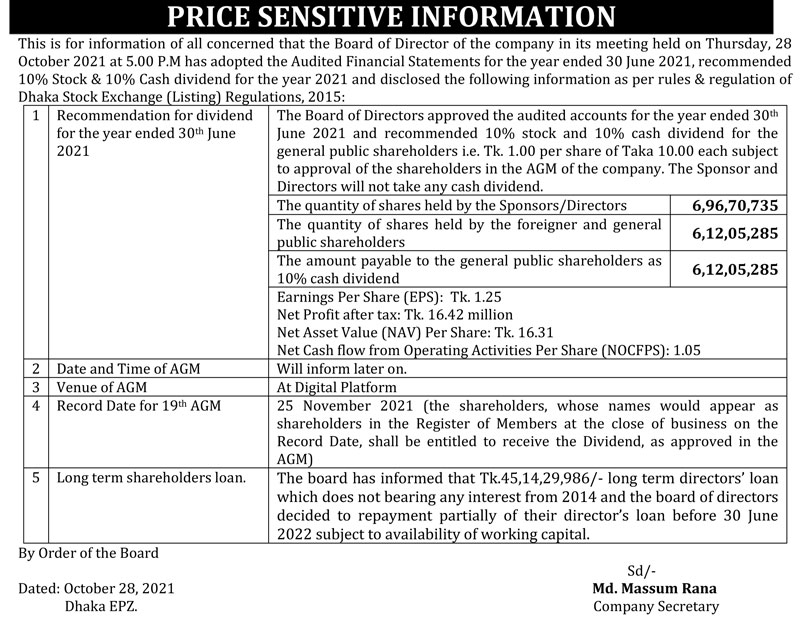 Price Sensitive Information of Queen South Textile Mills Ltd.