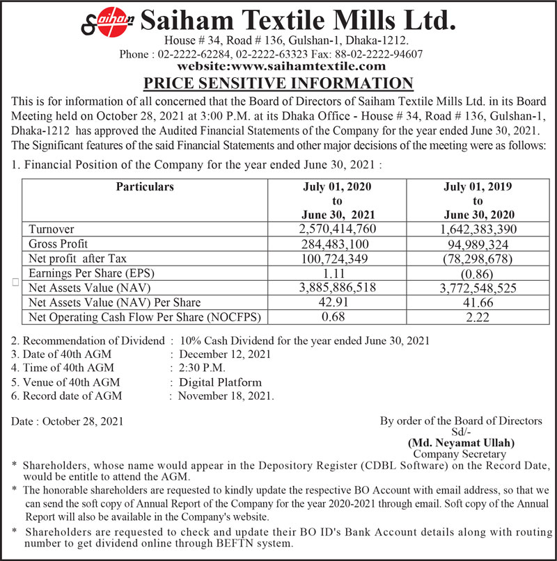 Price Sensitive Information of Saiham Textile Mills Ltd.