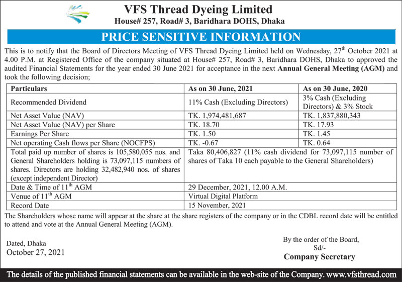Price Senstitive Information of VFS Thread Dyeing Limited