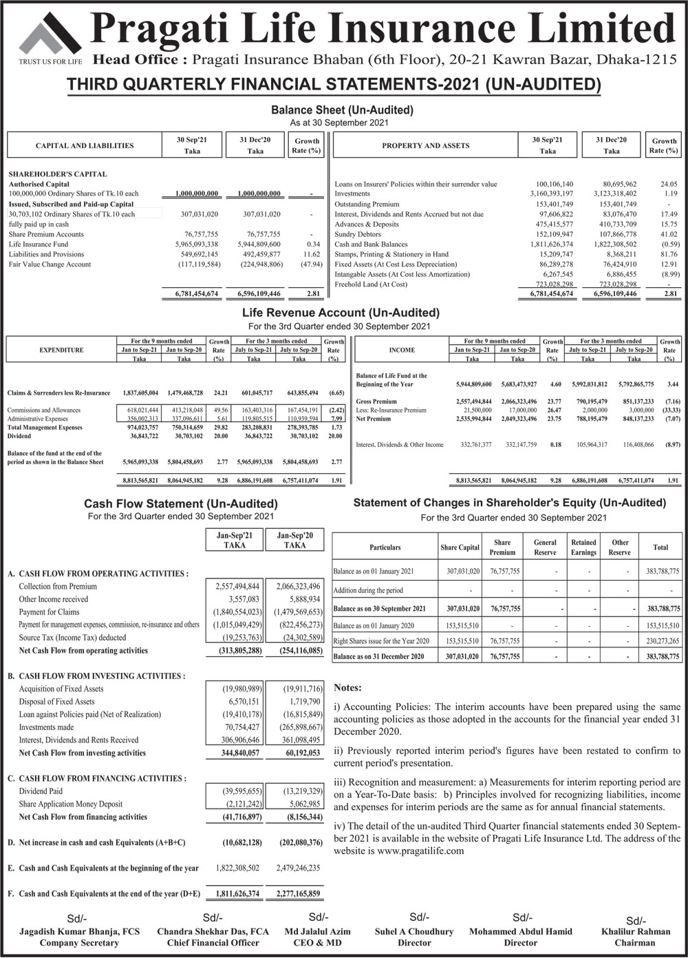 Q3 (Un-audited) Financial Statements -2021 of Pragati Life Insurance Limited
