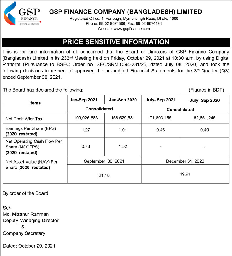 Price Sensitive Information of GSP Finance Company (Bangladesh) Limited