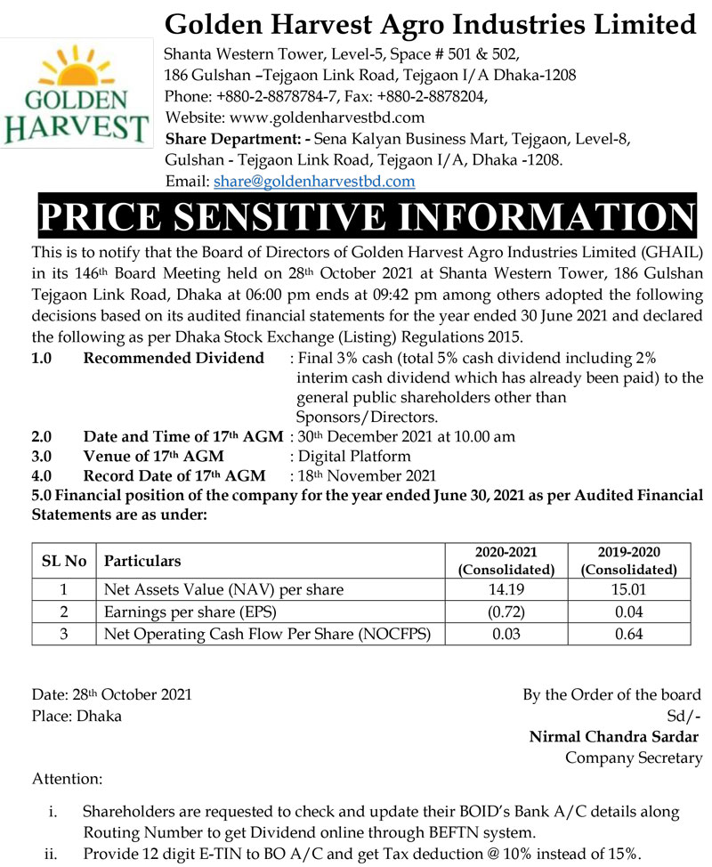 Price Sensitive Information of Golden Harvest Agro Industries Ltd