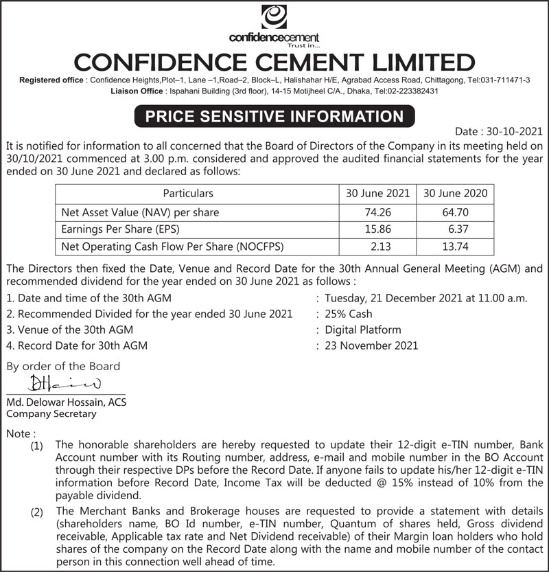 Price Sensitive Information of Confidence Cement Limited