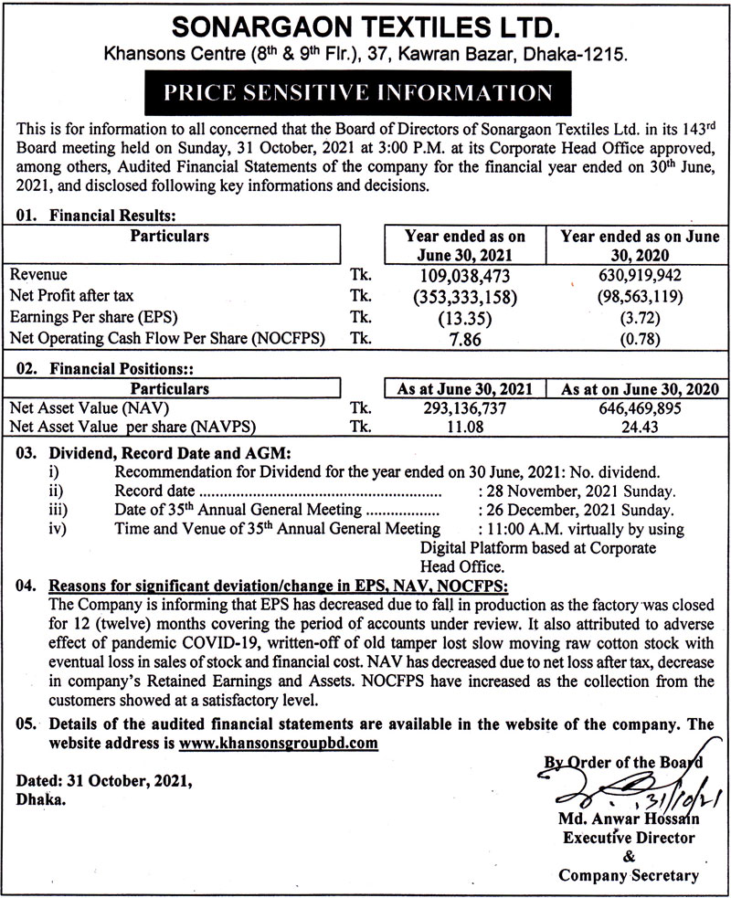 Price Sensitive Information of Sonargaon Textiles Ltd.