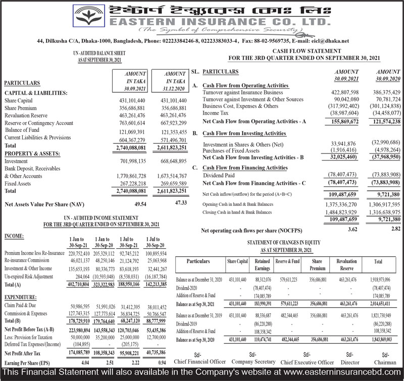 Price Sensitive Information (Q3) for the period ended September 30, 2021 of Eastern Insurance Co. Ltd.