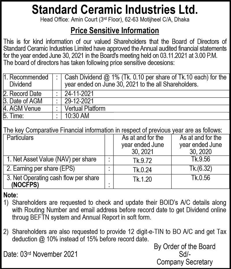 Price Sensitive Information of Standard Ceramic Industries Ltd.